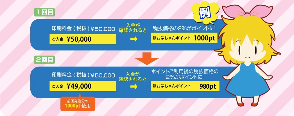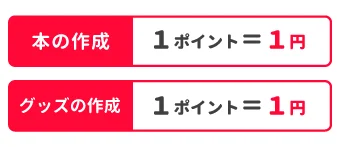 - 同人誌およびグッズの発注時(※印刷料金(税抜)のうち2%を付与)