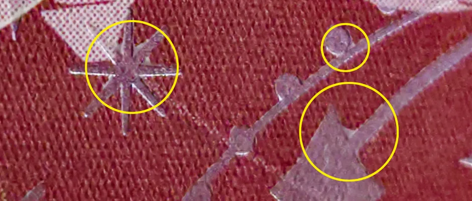 パール箔は細かい部分や白抜きが苦手な箔になります。特にエンボス紙、ラフ紙は上記の図のように抜ききれない部分が発生する事があります。