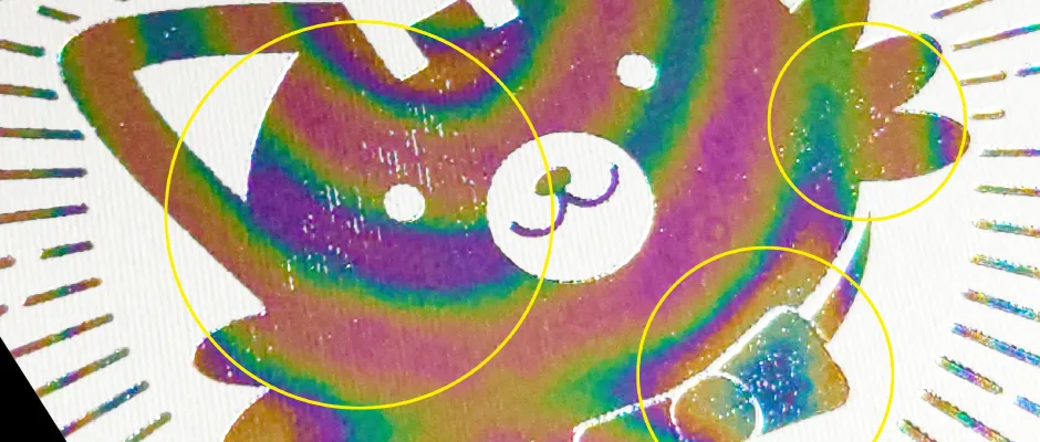 - ホログラム箔、リフレックス箔に関しては材料の性質上、模様の繋ぎ目部分(5~8mm程度)が稀に出てしまう場合があります。予めご了承ください。