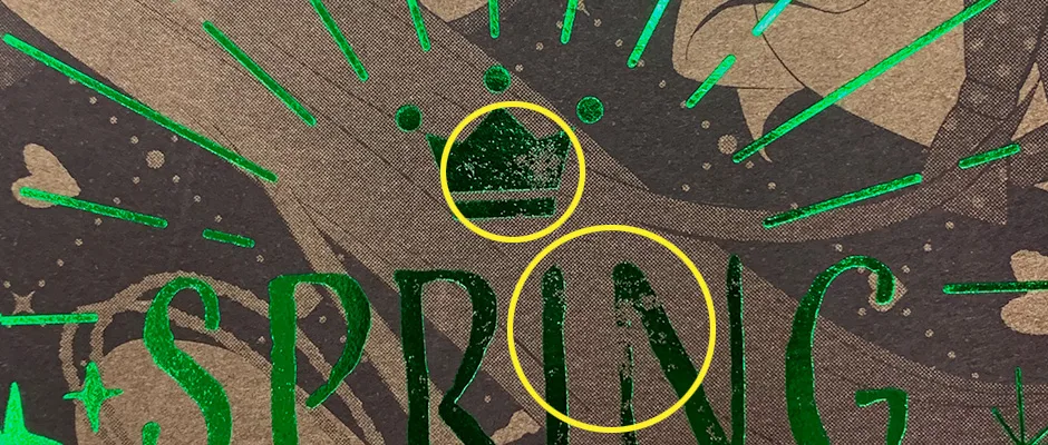 印刷部分と箔をぴったり重ねるイメージの場合、加工の際ブレが生じますので、白場が出る場合もあります。