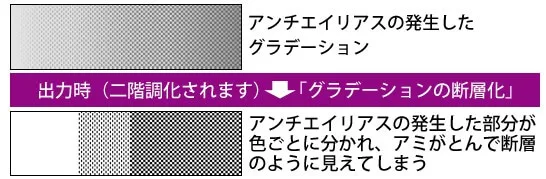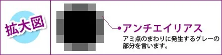 *アンチエイリアスは画面上でなめらかに見せる効果がありますが、印刷のモノクロ製版時解像度が低い場合はきれいに出力されません。