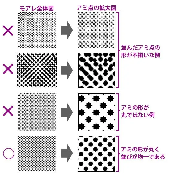 モアレが発生する原因は幾つかあります。多くはアミ点の形状がいびつだったり、並びやピッチが不規則だったりする場合に起こりやすくなります。また、上記のような方式の違いで、前回出なかったモアレが印刷所や発注の仕様を変更したことで予期せず発生するケースもあります。