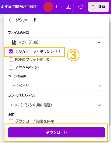 ③「トリムマークと塗り足し」にチェックを入れてください。