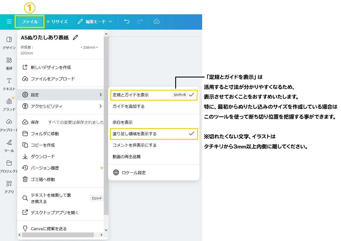 ①デザインを始める前に、「ファイル」→「設定」から「塗り足し領域を表示する」にチェックを入れておきます。