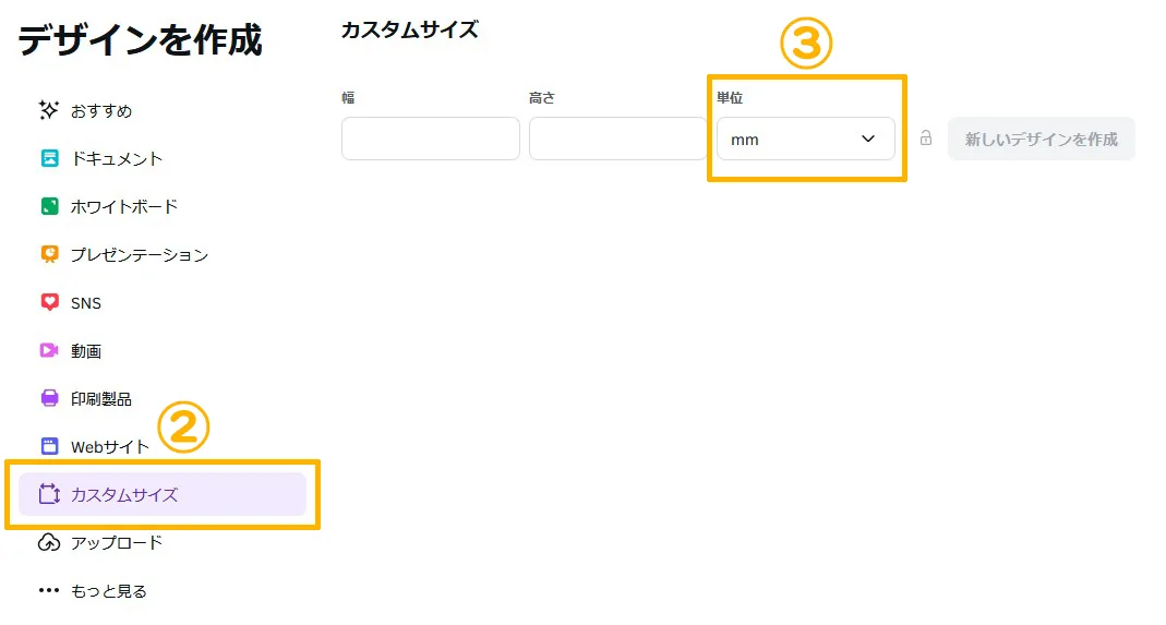 ②サイドメニューの「カスタムサイズ」をクリックします。
