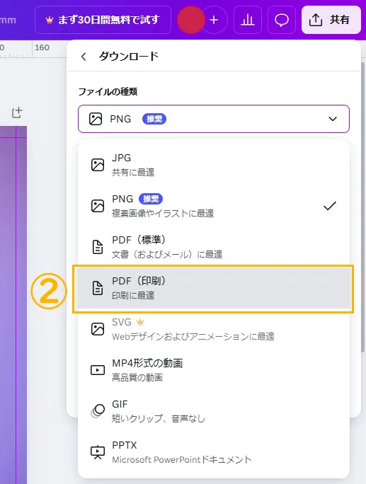 ①「ファイル」→「ダウンロード」または「共有」→「ダウンロード」を選択します。