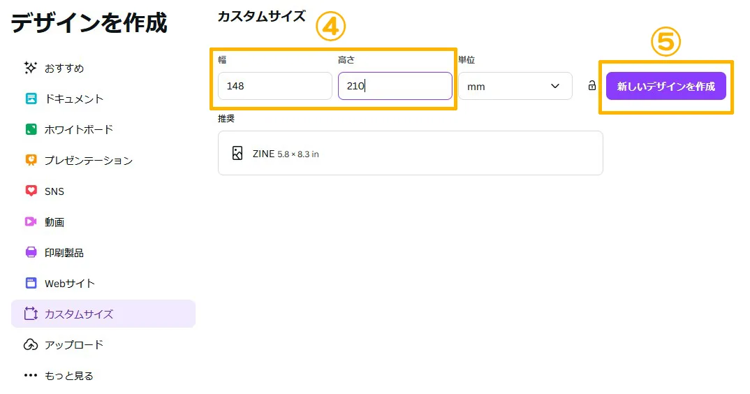 ⑤サイズが正しい事を確認し、「新しいデザインを作成」をクリックします。