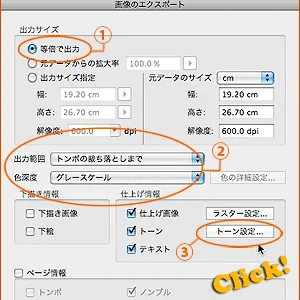 Comic Studio 4.0~4.3では、アミ点トーンにアンチエイリアスがあり「グレースケール」で書き出すとモアレが発生するため「モノクロ2階調」での書き出しをお願いしておりました。
