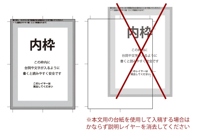 解説用のレイヤーがありますので、入稿する前には必ず消去してご入稿ください。