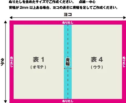 赤枠=仕上がり位置 青線=背表紙折り部分背幅やぬりたしによっては背表紙に白場が出てしまいます。