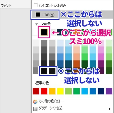 フォントの色は必ず以下の画像のように「スミ100%(黒、テキスト1)」を選択してください。