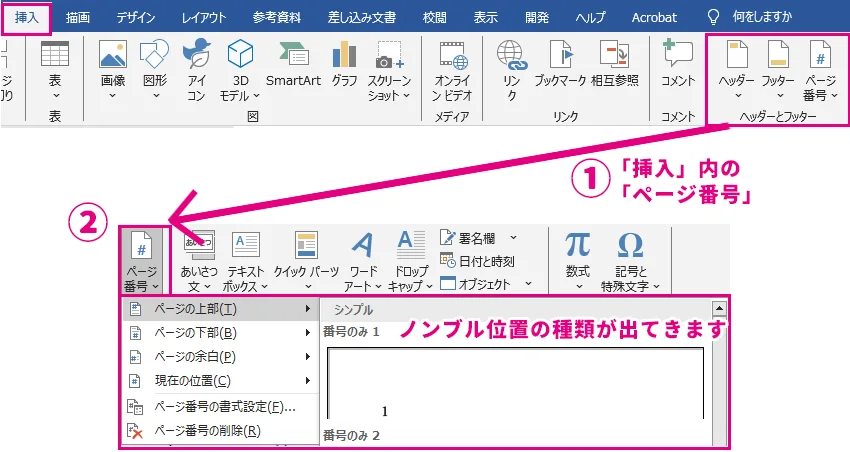 【Wordでのノンブルの設定の仕方(※Word2019)】