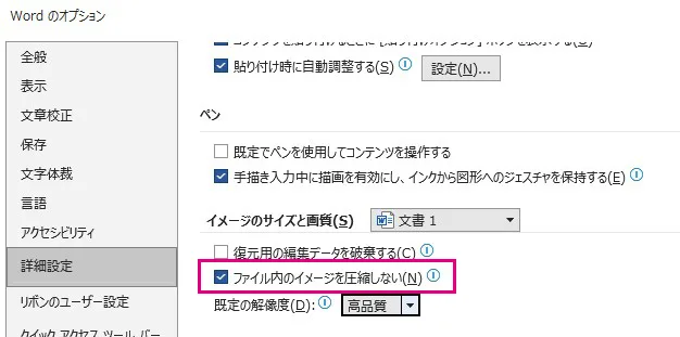 - 「ファイル内のイメージを圧縮しない」のチェックボックスにチェックを入れ、既定の解像度も高品質に上げてください。(※使用する画像素材そのものが低解像度の場合、後から上げても解像度は上がりませんのでご注意ください)