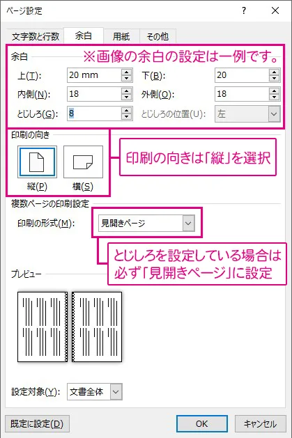 とじしろ設定時は、必ず「見開きページ」にチェックを入れてください。
