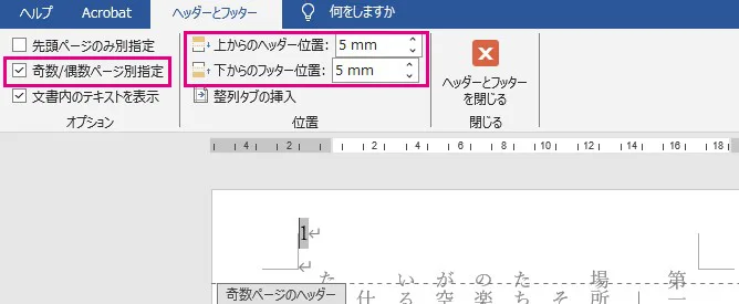 ■ページ番号の位置を奇数/偶数ページで変えたい・ページ番号の高さを変えたい場合、指定のヘッダー/フッターを選択中であれば上部に「ヘッダーとフッター」タブが表示されます。