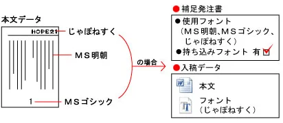 ご使用のフォント名は必ず全て発注時の備考欄に記入、またはメールにてお知らせください。その他のフリーフォント等をご使用の場合は原稿と一緒にお送りいただくか、WordではなくPDFに変換してご入稿下さい。