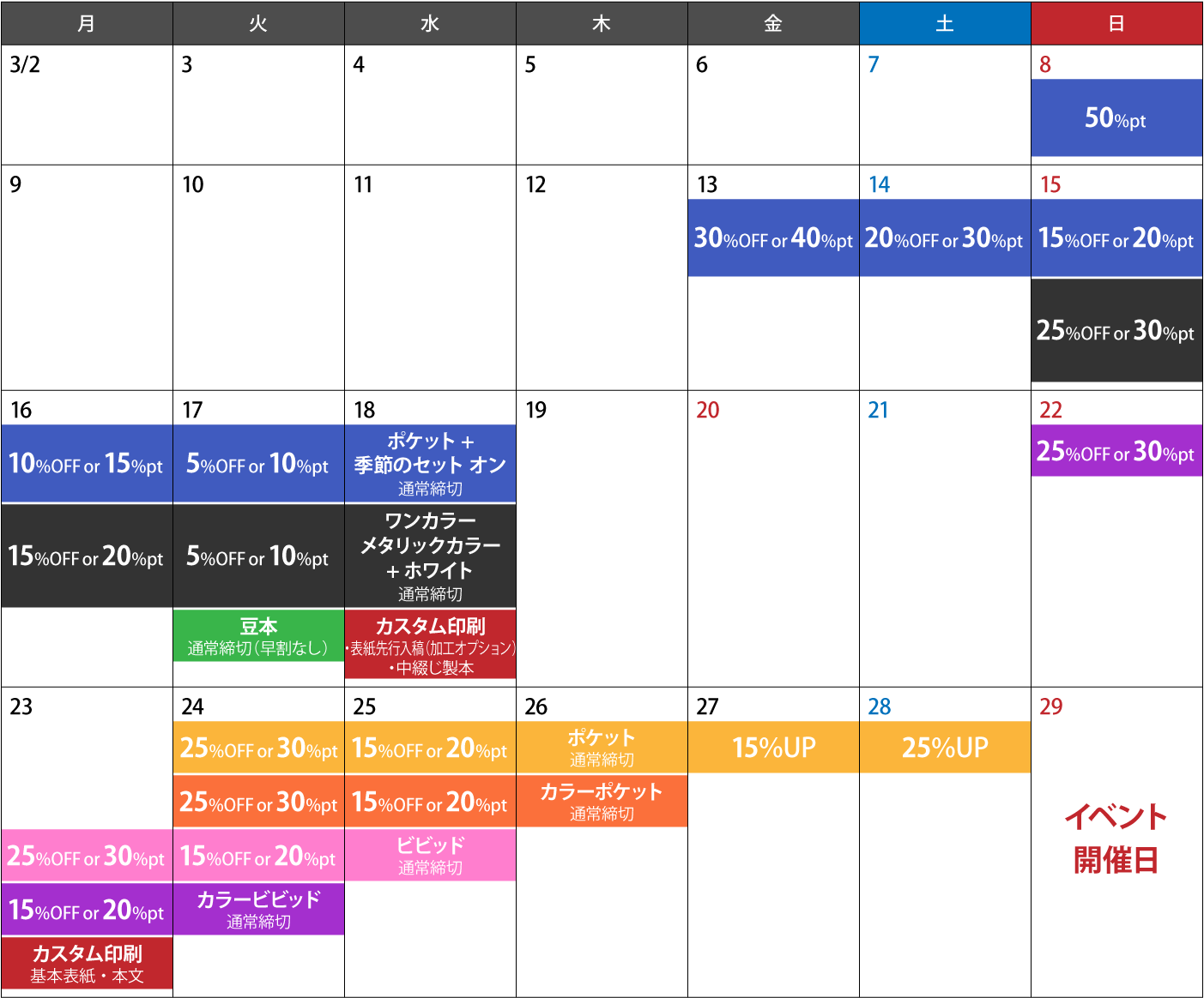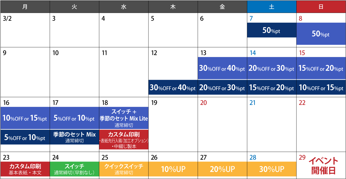 | 季節のセット オフ(スプリング) | カラー、モノクロ、2色、特色単色 | 単色特色 |