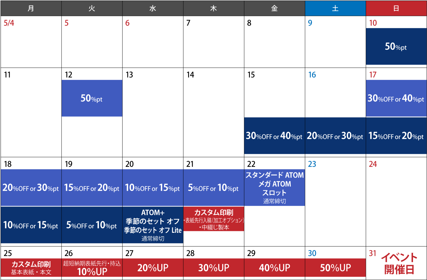 ※カスタム印刷はオプションや製本によって締切が変動いたしますので、詳しくは見積もりNaviをご利用ください。