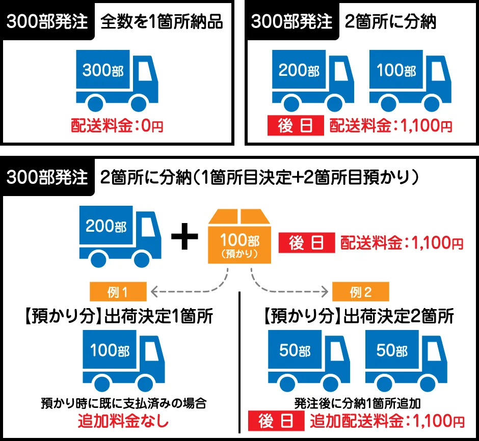 1箇所あたり1100円(税込)※発注部数に関わらず、配送先1箇所につき上記送料がかかります