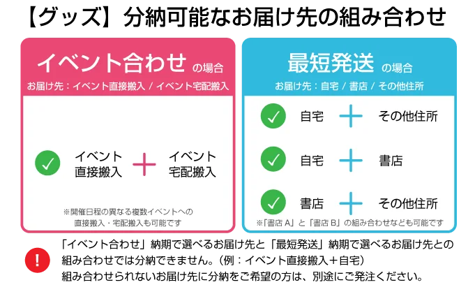 イベント欠席などの理由で注文確定後に商品の納品先・納品部数を変更されたい場合は、通常締切日までに出荷変更の旨をご連絡いただければ、変更手数料500円(税込)にて承ります。