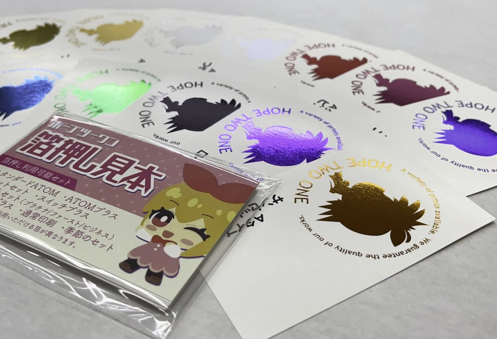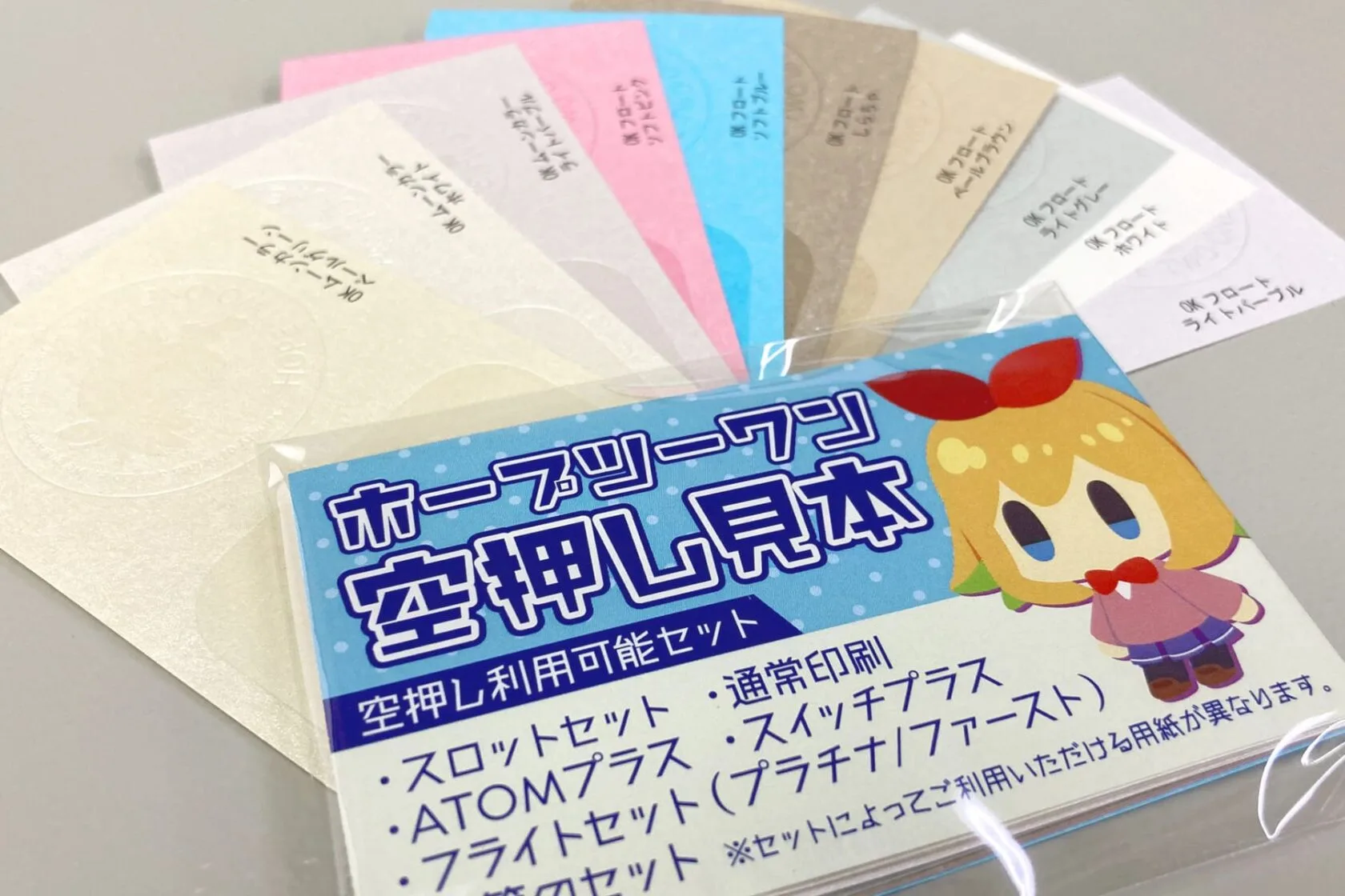 ホープツーワンの紙見本、インキ色見本、箔・空押しの資料を無料でお求めいただけます。ぜひ実際にお手に取ってご覧ください。