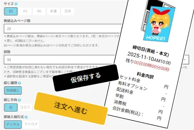 また、事前に会員登録いただくと、選んだ仕様の「仮保存」と「配送料の見積もり」をご利用いただけます。仕様を仮保存することで、原稿が完成次第すぐに発注できるようになります。