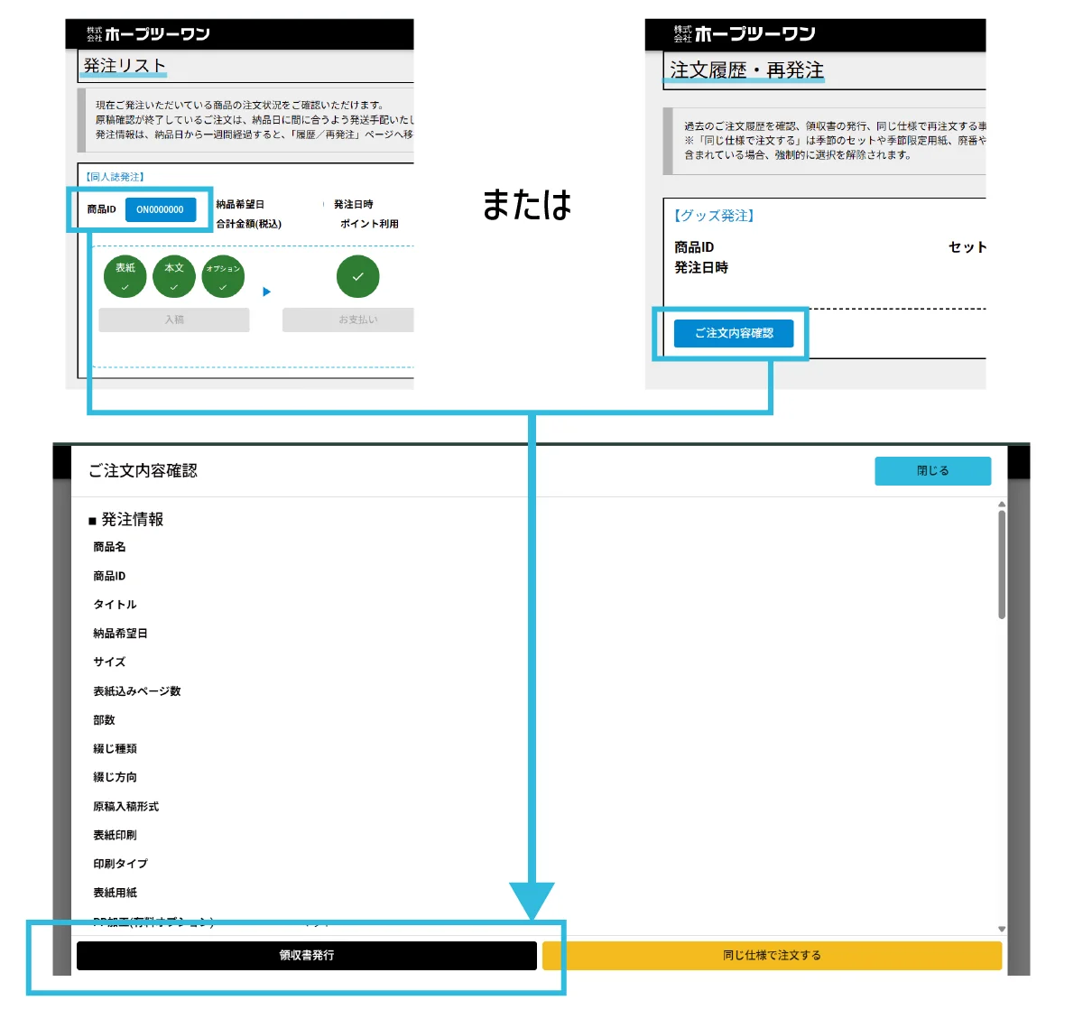 - 次の手続き(入稿・お支払い・納品指示など)までの流れがわかりやすい導線