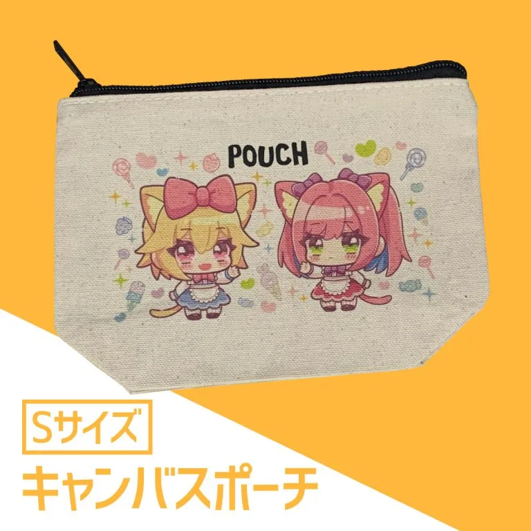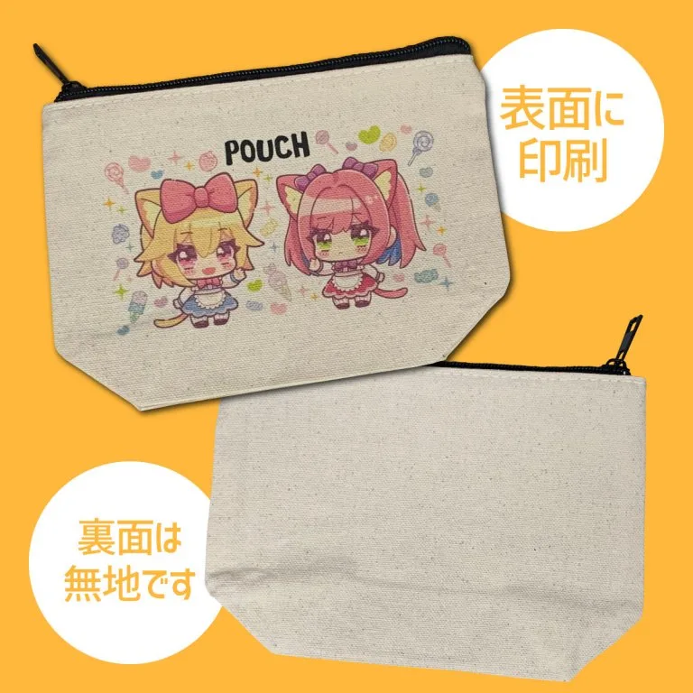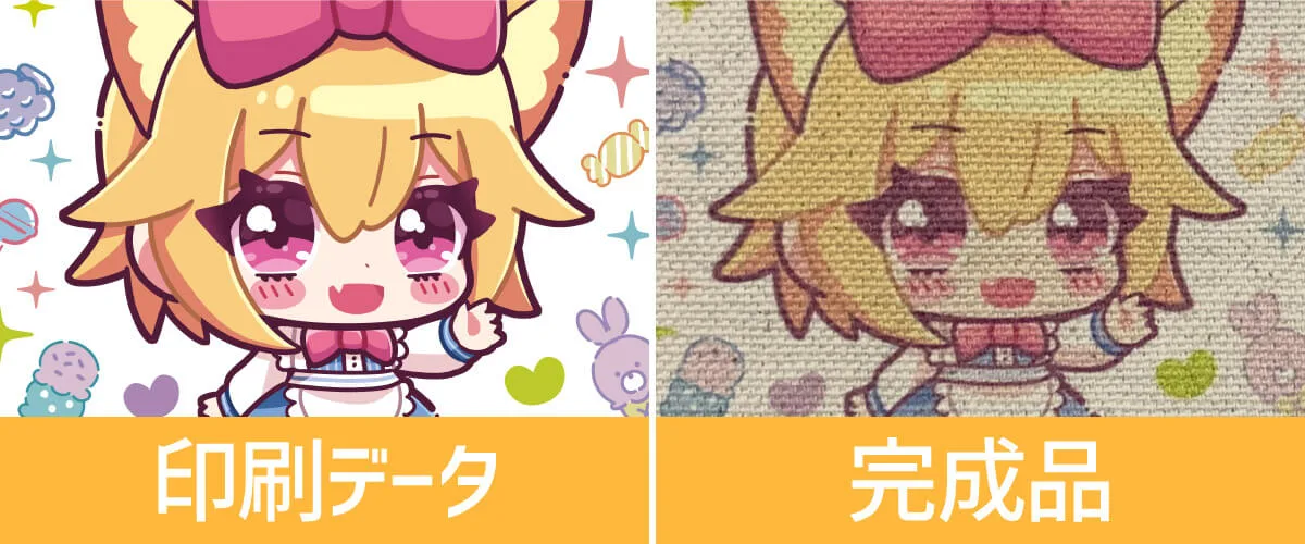 ※インクジェットフルカラー印刷とは直接生地にインクを吹き付け印刷する印刷方法です。生地の影響を受けやすい印刷になっており、キャンバス生地は黄色味がかかっている為全体的にイエローが足されたような色合いに仕上がります。薄い黄色やベージュなどはキャンバス色と近い色の為見えにくくなります。また、青や紫など薄めの色合いは若干グレー色になりますのでご注意ください。