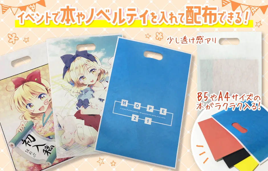 - 必ず不織布バッグ用データをご用意ください。同人誌表紙データのサイズでは受付できません。