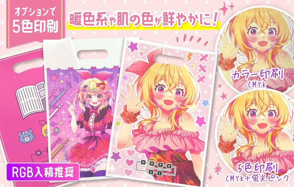 印刷機が自動的にデータを確認し蛍光ピンクを加えますため、RGBデータをそのままご入稿ください。(カラープロファイル:sRGB推奨)
