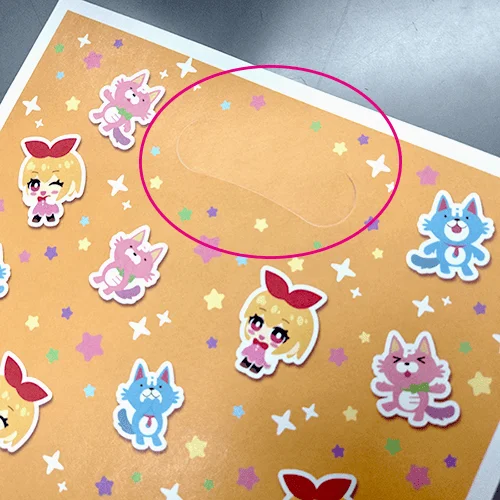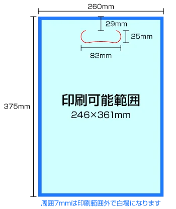 持ち手(小判抜き)部分にも印刷されますが、持つ際に内側に折りこまれますので重要な絵柄や文字などがかからないように注意してデザインください。