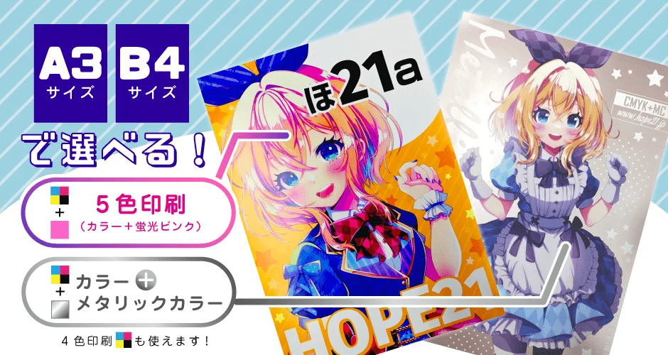 A3・B4サイズ限定で、暖色系カラーが鮮やかな「5色印刷(CMYK+ピンク)」と特色が上品に煌めく「5色印刷(CMYK+メタリックカラー)」をご利用いただけます。もちろん「4色印刷(CMYK)」もご利用可能!それぞれのデータ作成方法についてはページ下部をご確認ください。
