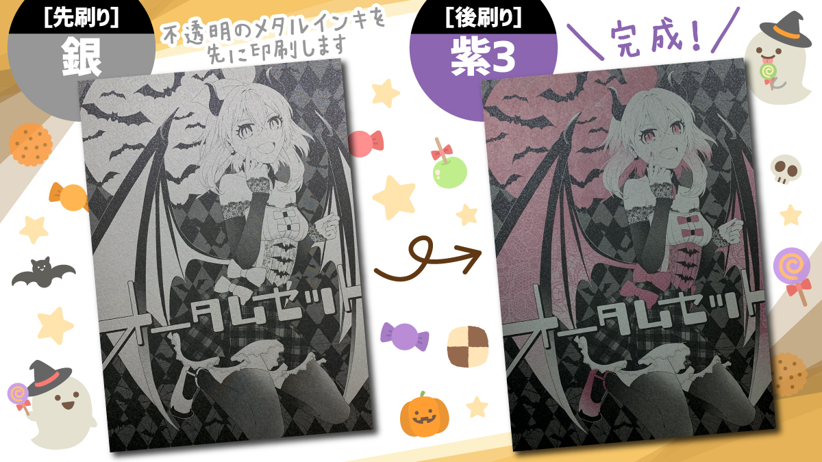 ・メタルインキを2色目にすると、先に印刷されたインキは隠れてしまいます。