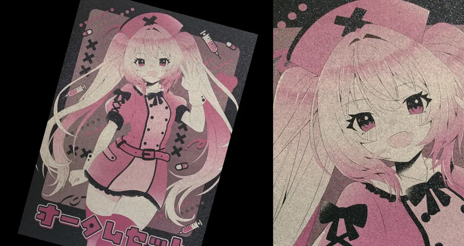 宝石のような輝きを持つミランダに不透明インキのシャンパンゴールドを印刷し、その上に透明インキの赤2を乗せました。