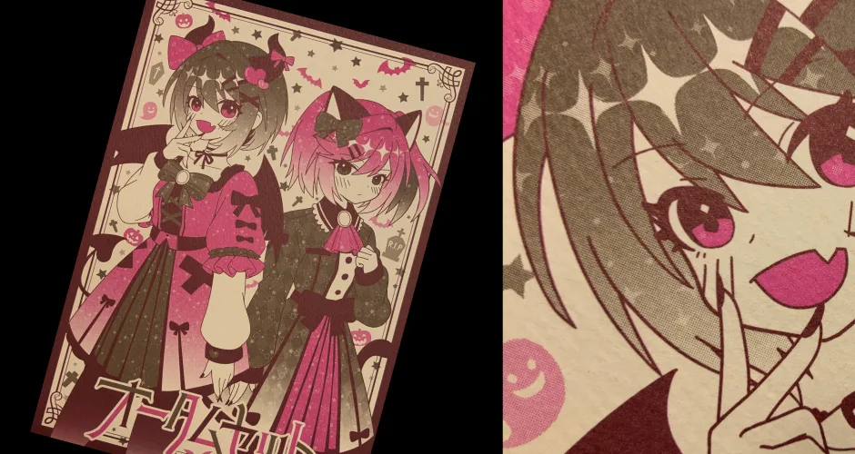 - オンデマンド印刷の上に加工を行った場合、トナーが溶けて黒ずんだり剥がれる場合がございます。オンデマンド印刷の場合は絵柄の無い白場部分への加工をおすすめいたします。