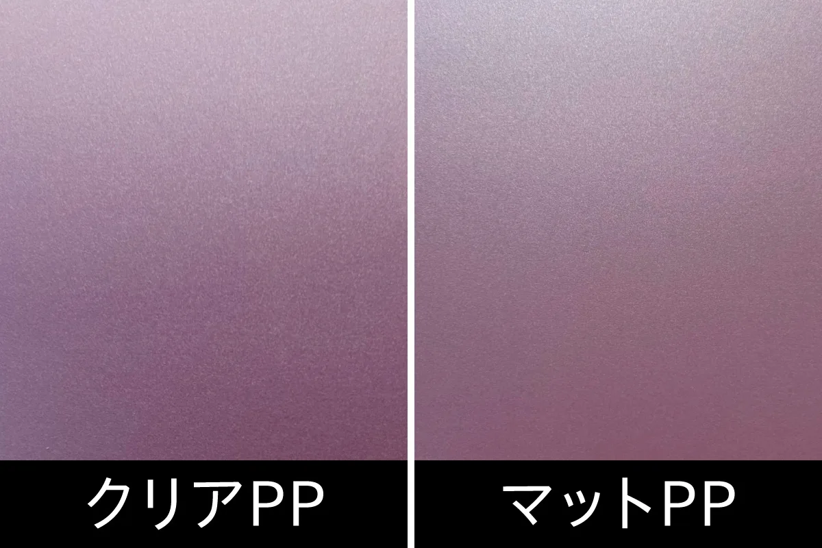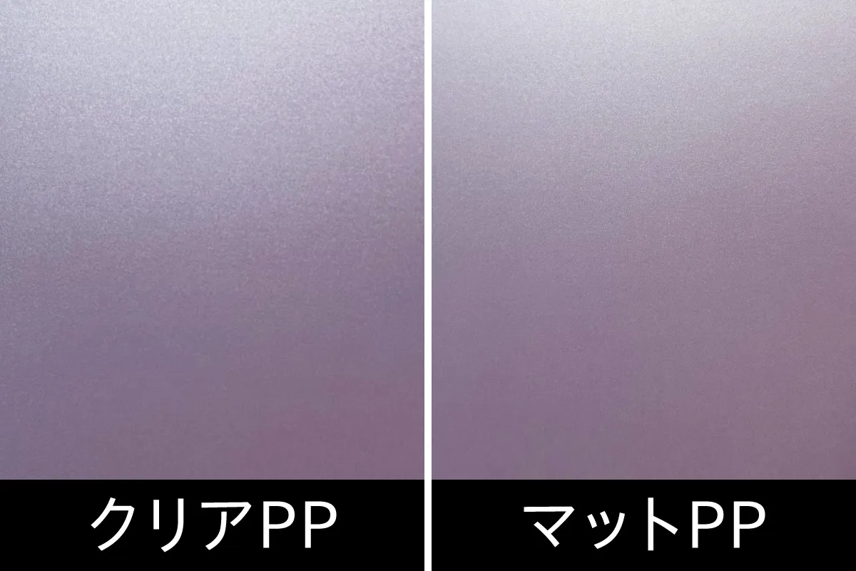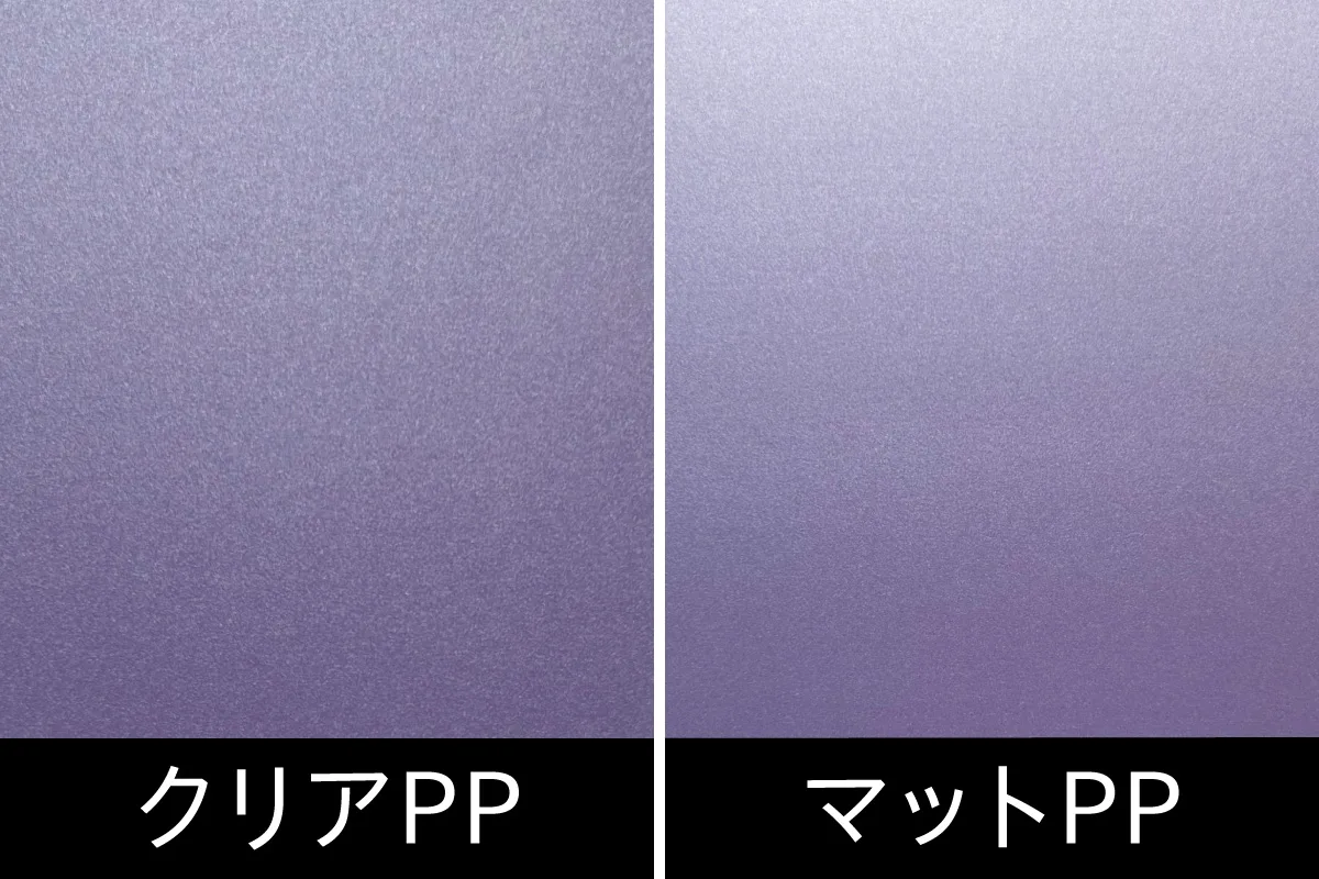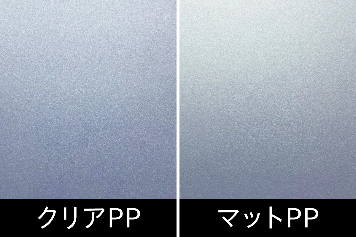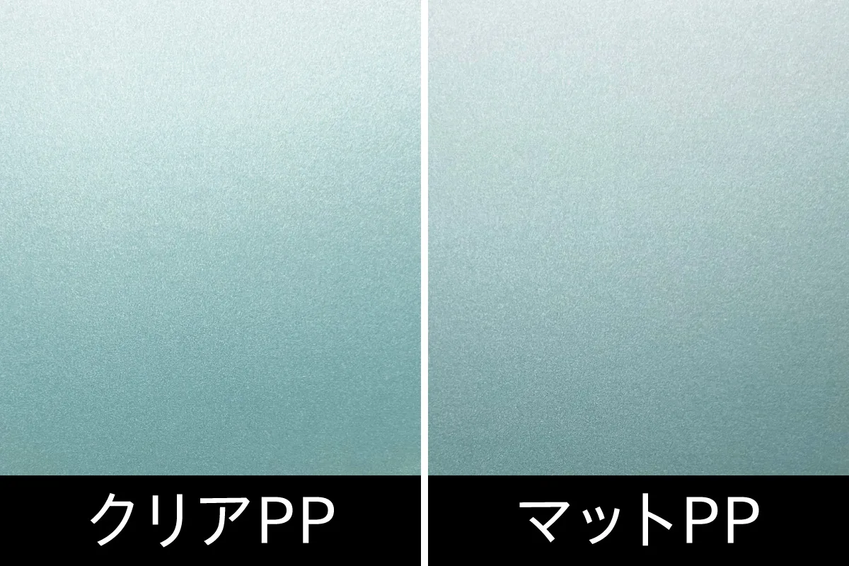 クリアPPは色が少し濃く、メタリック感が少し強く表現され、ツヤのある光沢感が出ます。マットPPはツヤのない落ち着いた仕上がりになります。色味は実際のものと異なるため、参考程度にしてください。