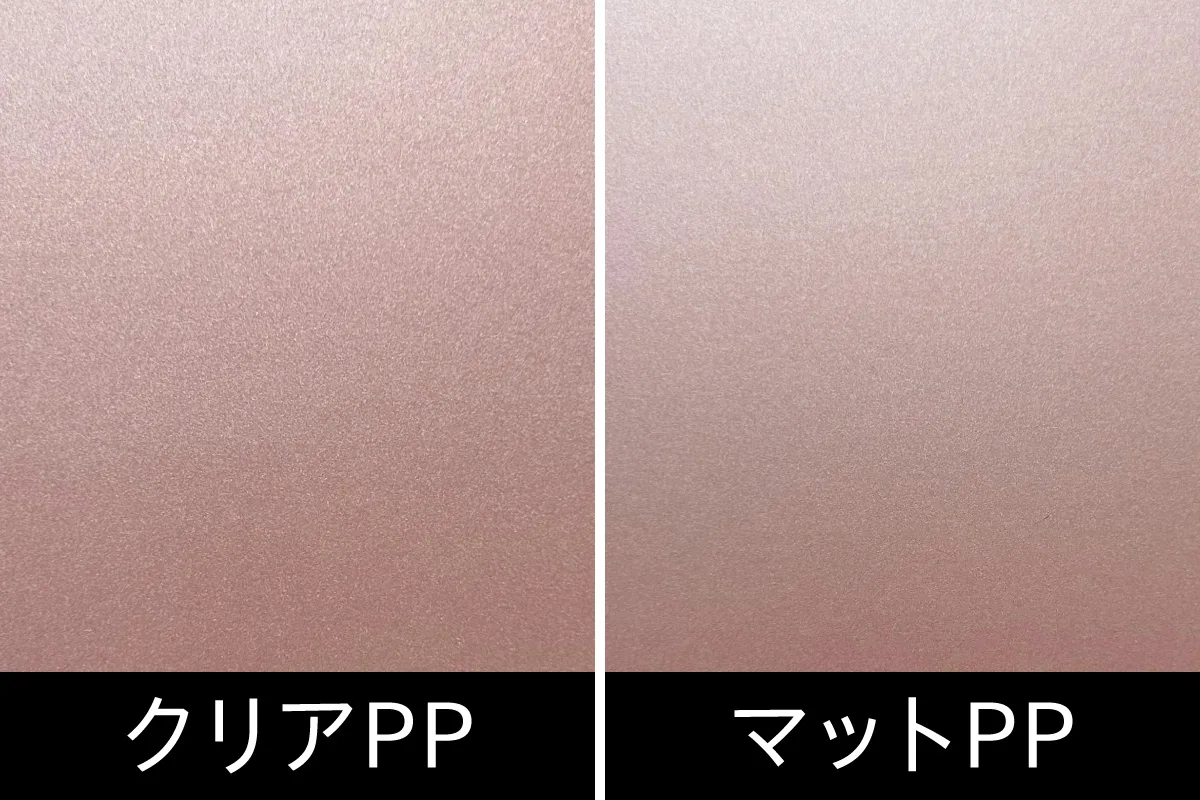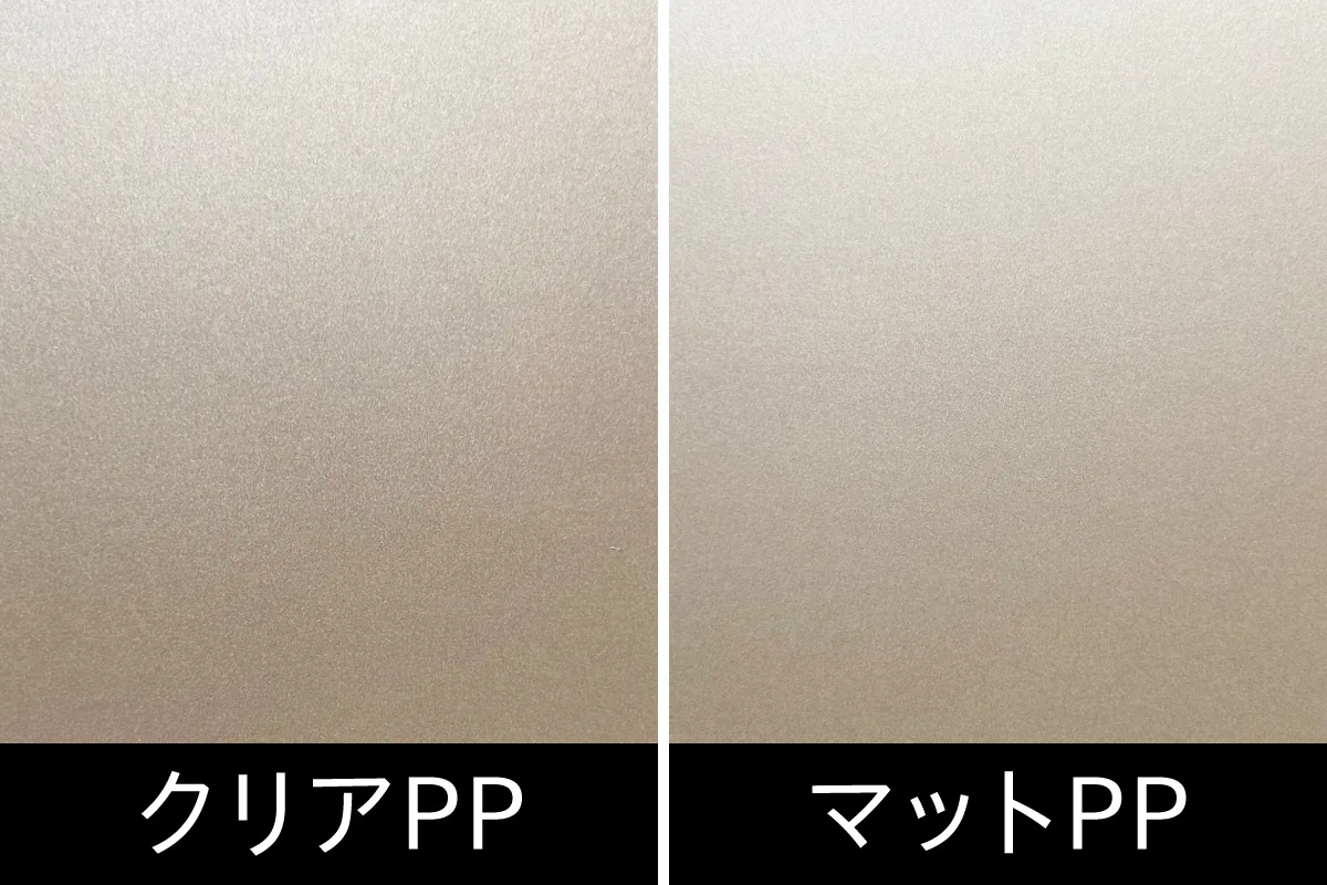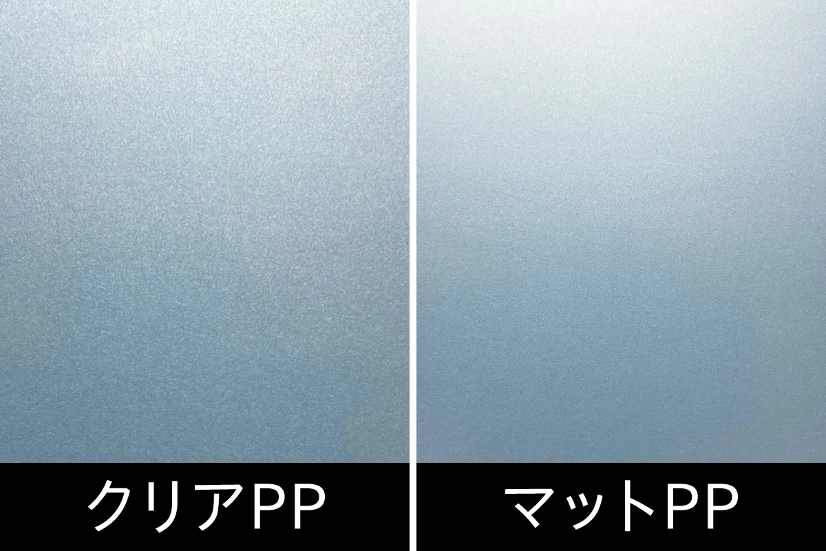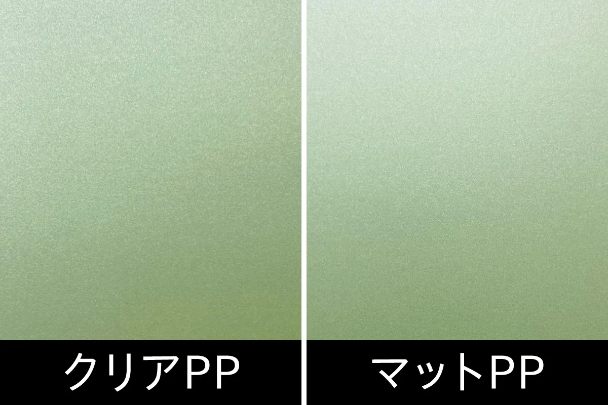 クリアPPは色が少し濃く、メタリック感が少し強く表現され、ツヤのある光沢感が出ます。マットPPはツヤのない落ち着いた仕上がりになります。色味は実際のものと異なるため、参考程度にしてください。