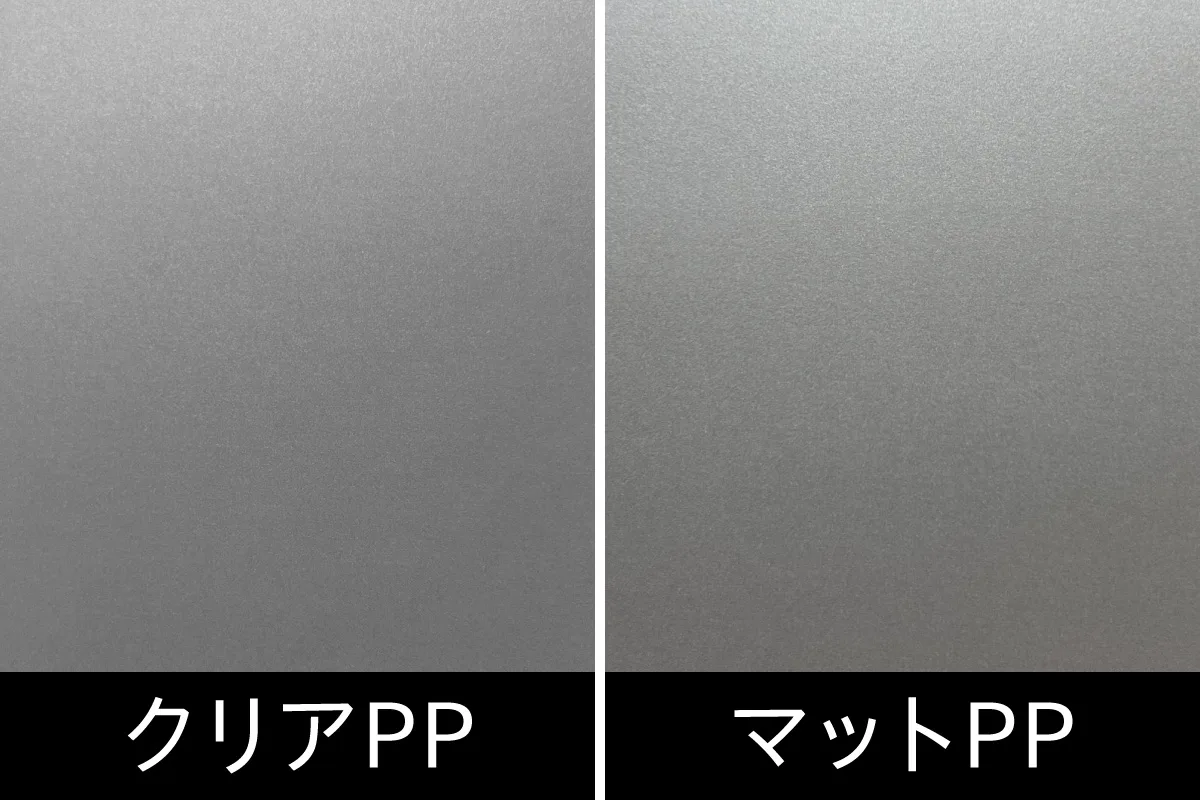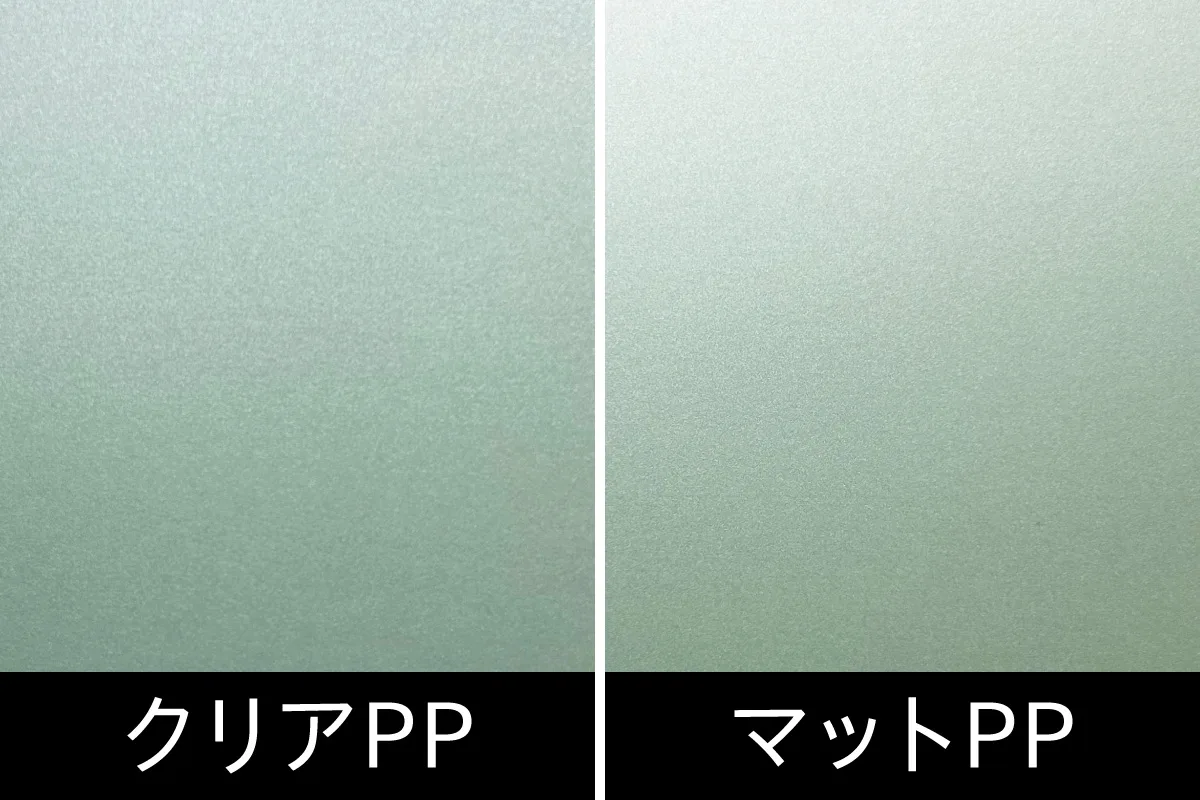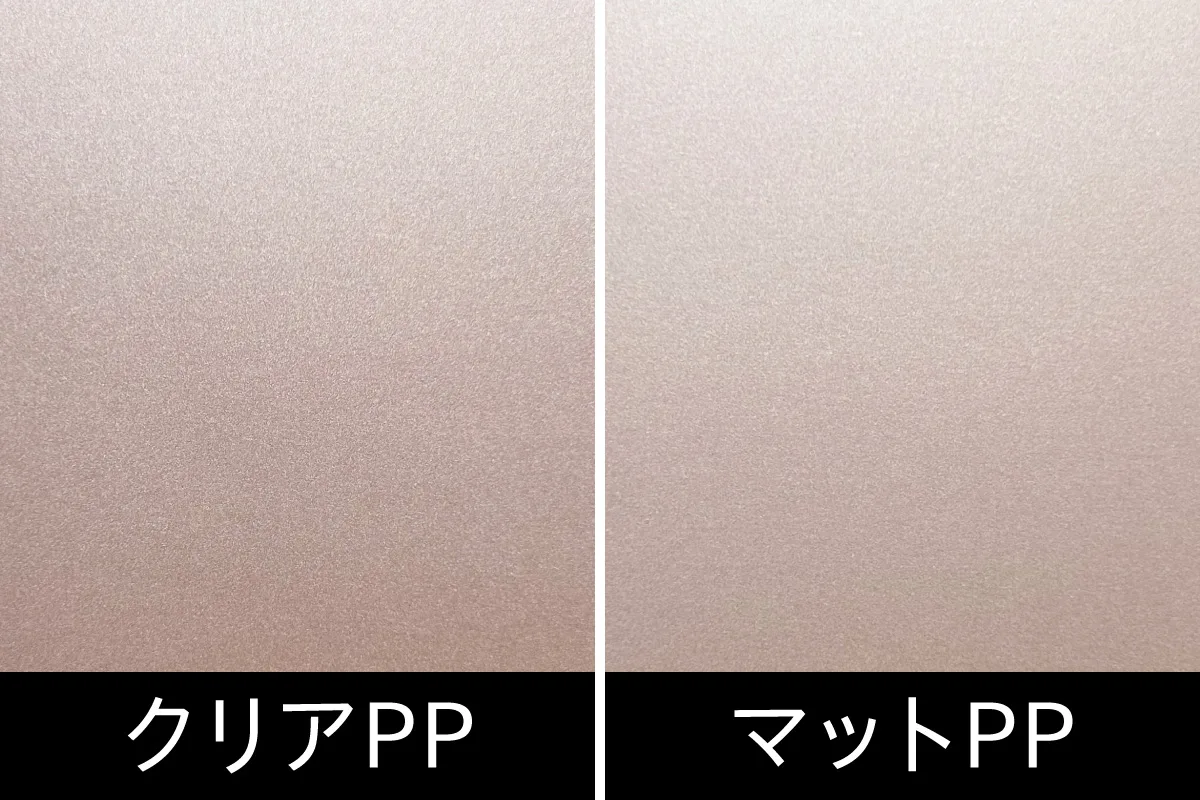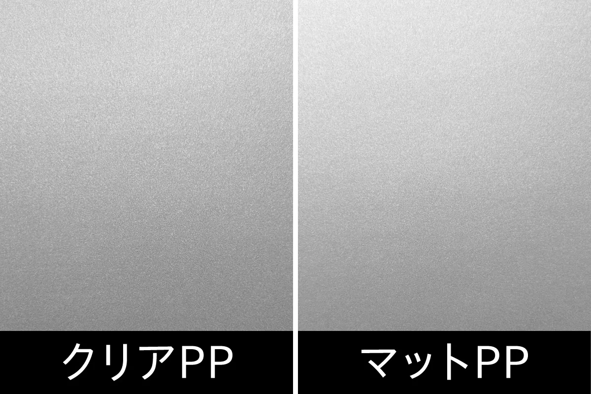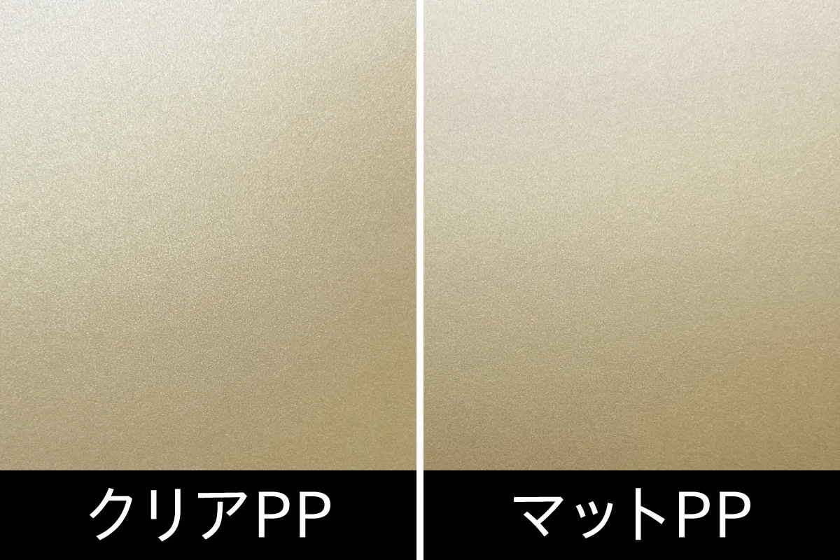 クリアPPは色が少し濃く、メタリック感が少し強く表現され、ツヤのある光沢感が出ます。マットPPはツヤのない落ち着いた仕上がりになります。色味は実際のものと異なるため、参考程度にしてください。