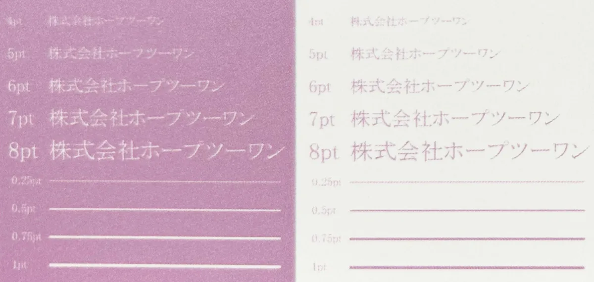 メタリックカラーは細い線や文字、細かい白抜きを綺麗に印刷できない場合がございます。太い文字や広範囲でご使用ください。またグラデーションやグレースケールの印刷も可能ですが、表現性が難しいため黒(RGB000またはK100%)をオススメしています。