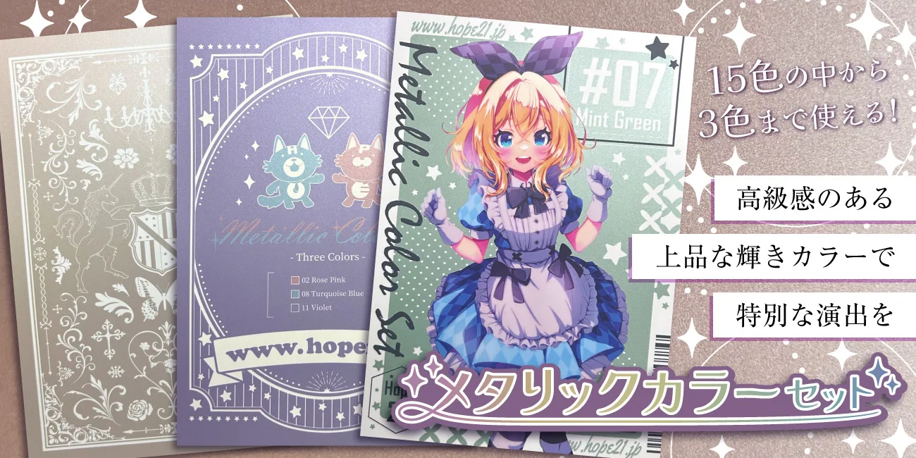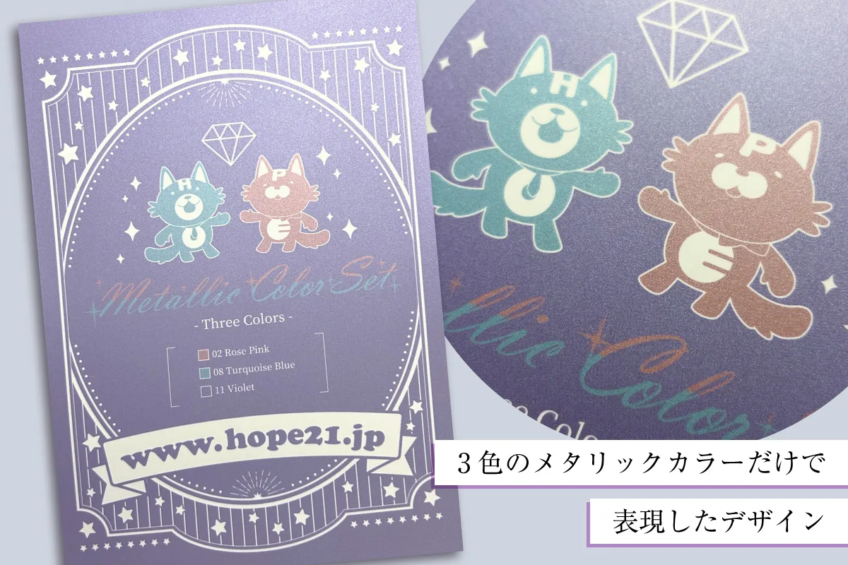 - メタリックカラーは細い線や文字、細かい白抜きを綺麗に印刷できない場合がございます。太い文字や広範囲でご使用ください。