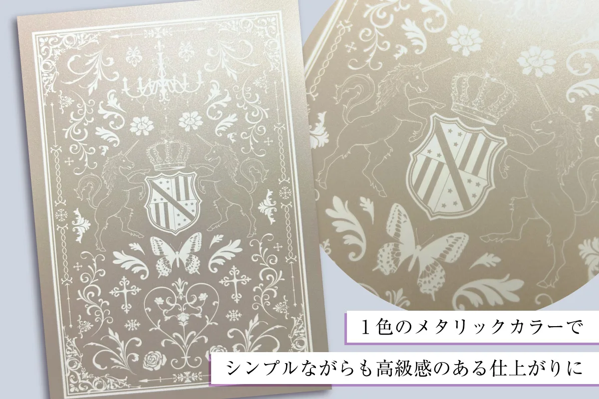 表紙にオンデマンド印刷のカラーとメタリックカラー(15色の中から最大3色まで)が使えるセット!シルバーベースのメタリックカラーは、光や見る角度によって上品にきらめくのが特長です。カラーイラストと組み合わせたり、メタリックカラーだけでデザインしたりする事で高級感を演出することができます!