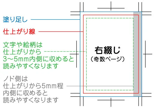 ※ページ数に限らず、ノド側(綴じ側)は読みづらくなります。原稿作成の際は大切な文字やイラストはノド際に配置しないよう、お気を付けください。