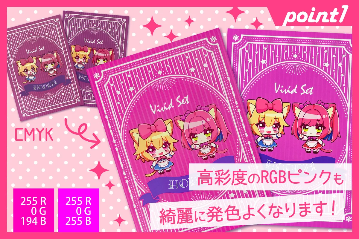 蛍光ピンクを加えた5色オンデマンドカラー印刷(CMYK+蛍光ピンク)により、従来のカラー印刷(CMYK)では表現の難しかった暖色系(ピンク・オレンジ・紫)が色鮮やかに、よりRGBに近い印刷に!人物の肌もキレイな発色に仕上がります!