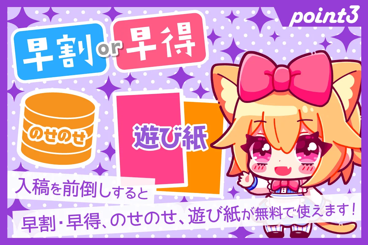 ※括弧内表記(+●日)は締切が前倒しになる日数です。 ※遊び紙と口絵の併用はできません。