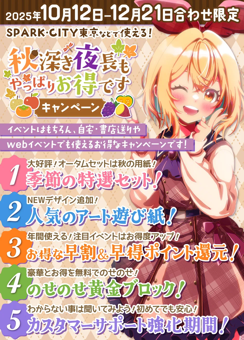 基本ラインナップは注目イベント時登場のver.オフセットとVer.オン/オフMix。期間中いつでもご利用できるver.オンデマンド、オフセットLite、オン/オフMixLiteの5つ!もちろん、季節のセットと相性ピッタリ「アート遊び紙」から秋限定遊び紙もセット料金内でご利用いただけます!