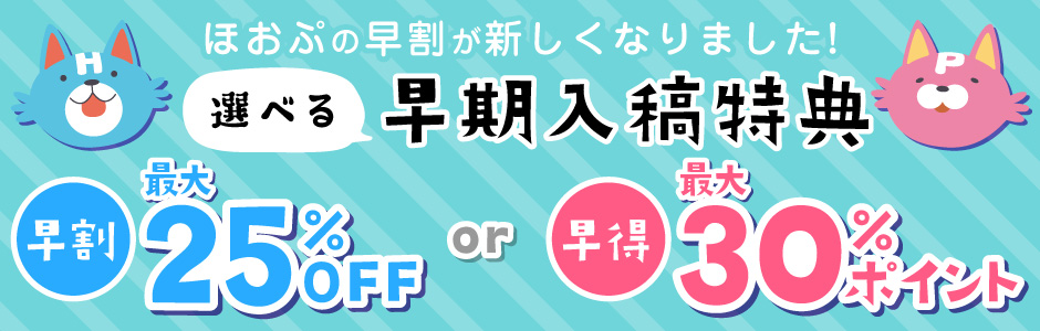 「セット早割」なら年間通して最大20%OFF!「セット早得」なら、早割よりも還元率が高く、最大30%還元!早割・早得設定は1日刻みなので原稿の進み具合に合わせて、お好きな締切をお選びください。さらに注目イベント限定で最大30%OFFと最大50%還元!対象納品日は開催中のキャンペーンにてご確認ください。