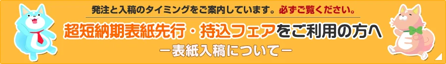 表紙については「超短納期表紙先行・持込フェアをご利用の方へ」を必ずお読み下さい。 - 本文は表紙先行入稿した発注から入稿してください。