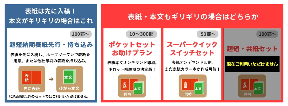 超短納期お助け企画とは、「通常締切が間に合わないので、それよりも少しでも後に入稿したい」という方に向けた企画です。少しでも作成時間が欲しい方をお助けします。通常締切より遅い締切の為、選択できる仕様に制限がございますが、なんとかしてご本をイベントに出したい方、必見です。