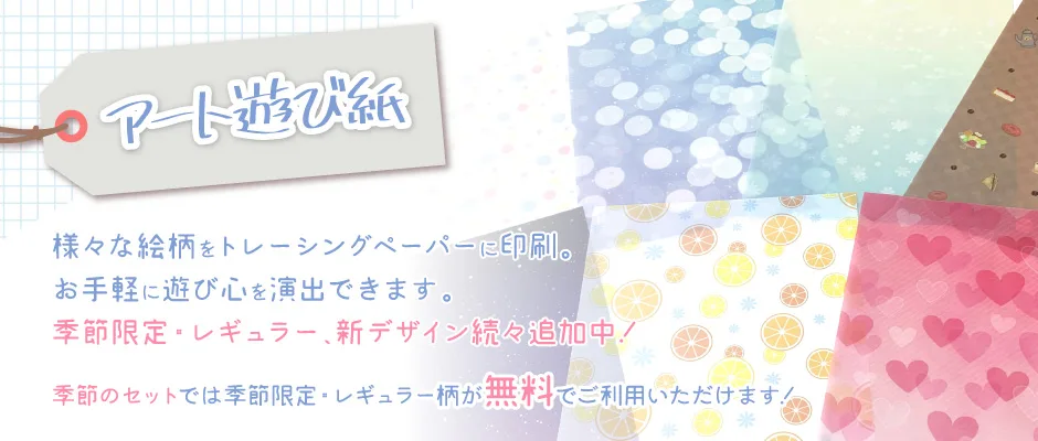 - 各セットでアート遊び紙を前後でご利用の場合は、前後同じ柄となります。またイメージの天地を逆にしてのご利用はできません。(カスタム印刷は除く)
